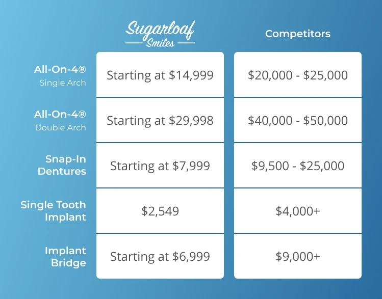 At Sugarloaf Smiles, we’ve raised the bar for quality while lowering the financial hurdles associated with dental implant treatment. We specialize in dental implants, and have an on-site lab, allowing us to deliver the best results, in the least amount of time, at the lowest possible price.